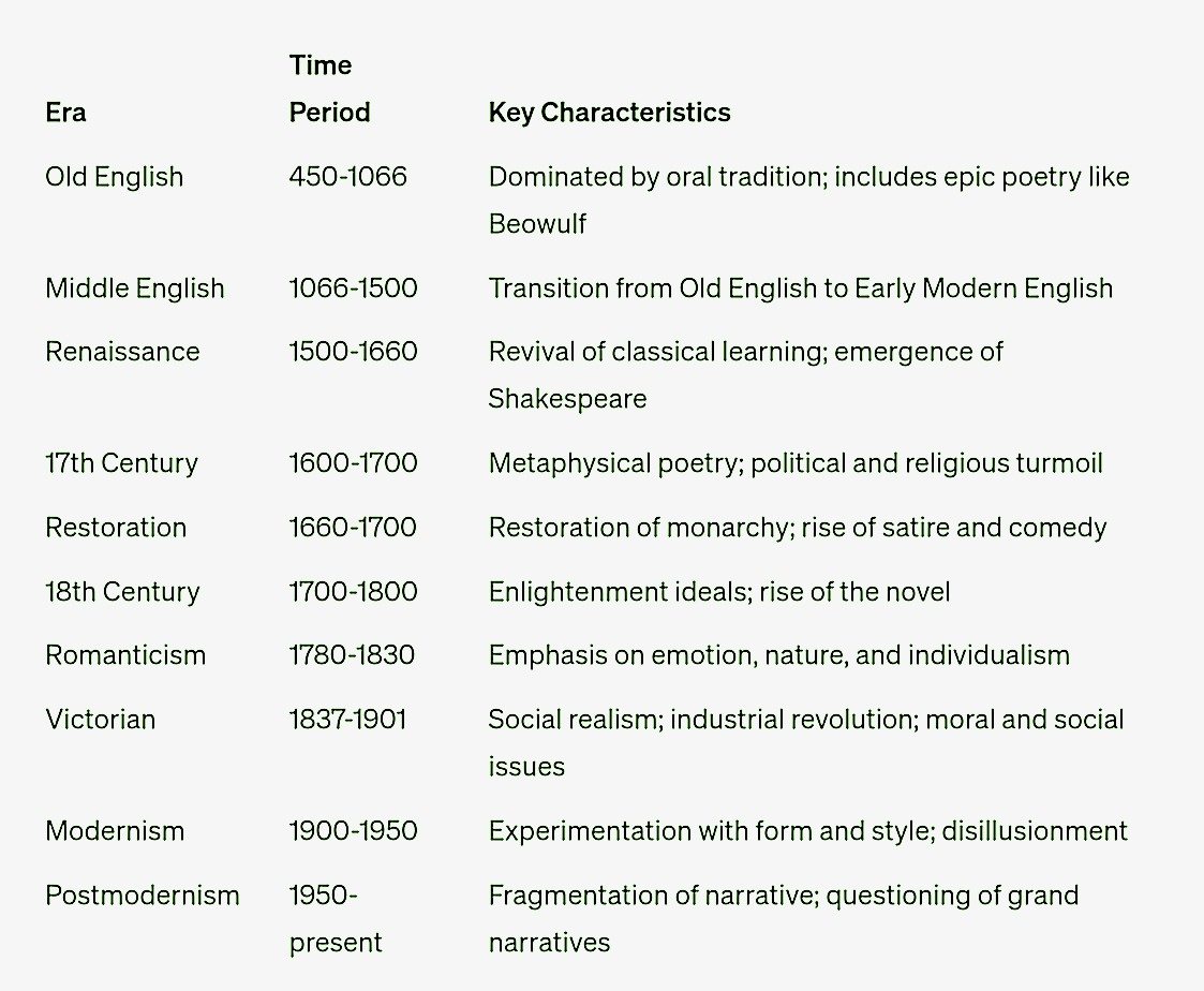 English literature is a vast and rich field encompassing works written in the English language throughout history. It includes a diverse range of genres, styles, and themes, reflecting the social, cultural, and political contexts of different periods. Some key periods and movements include Old English literature (e.g., Beowulf), the Renaissance (e.g., Shakespeare), the Romantic era (e.g., Wordsworth, Keats), the Victorian era (e.g., Dickens, Brontë), modernism (e.g., Joyce, Woolf), and postmodernism (e.g., Rushdie, Atwood). Studying English literature offers insights into human experiences, emotions, and ideas, and helps us understand the evolution of language and storytelling over time.